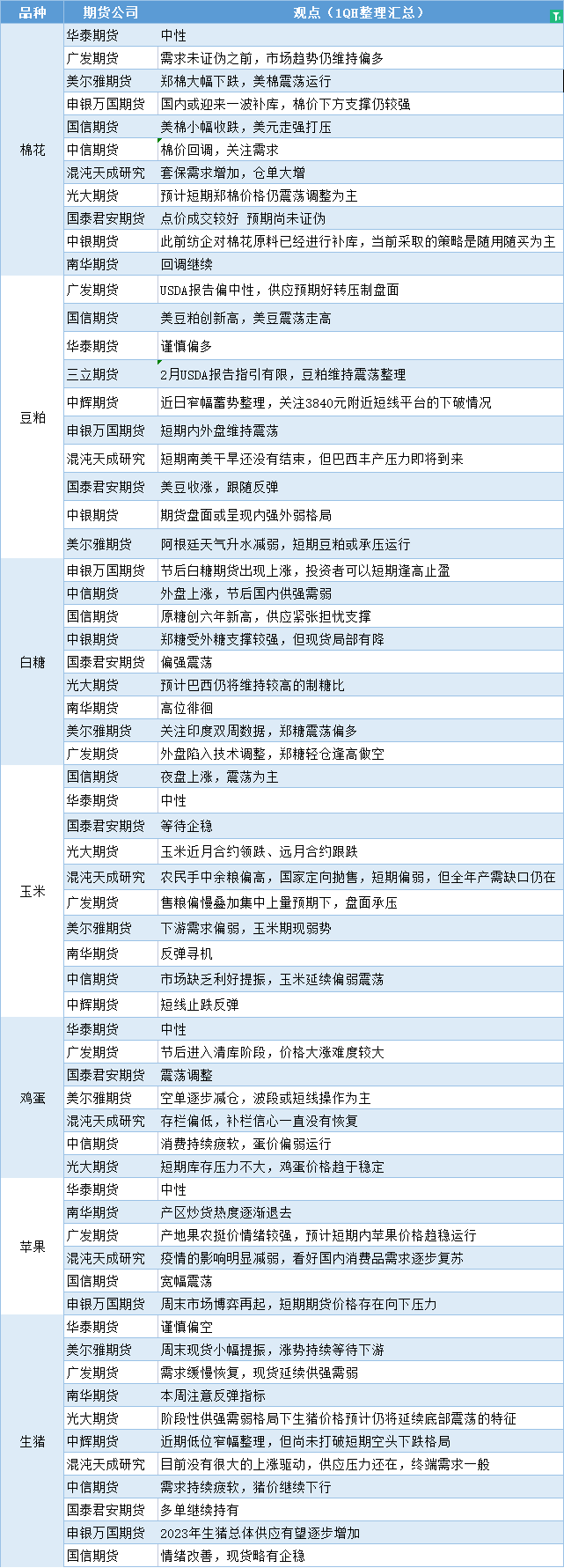 汇通财经APP讯——期货公司观点汇总一张图:2月13日农产品(棉花、豆粕、白糖、玉米、鸡蛋、生猪等)日期:2023-02-13 00:00