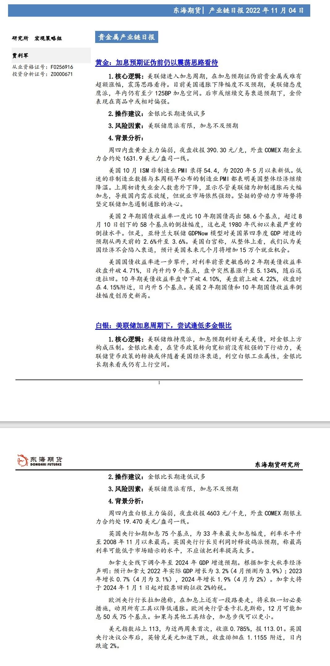 【东海期货11月4日产业链日报】贵金属篇:长短期美债利率倒挂加深,金银偏弱震荡