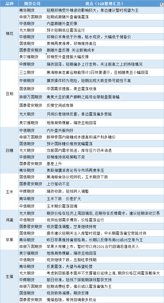 期货公司观点汇总一张图:11月3日农产品(棉花、豆粕、白糖、玉米、鸡蛋、生猪等)日期:2022-11-03 11:23
