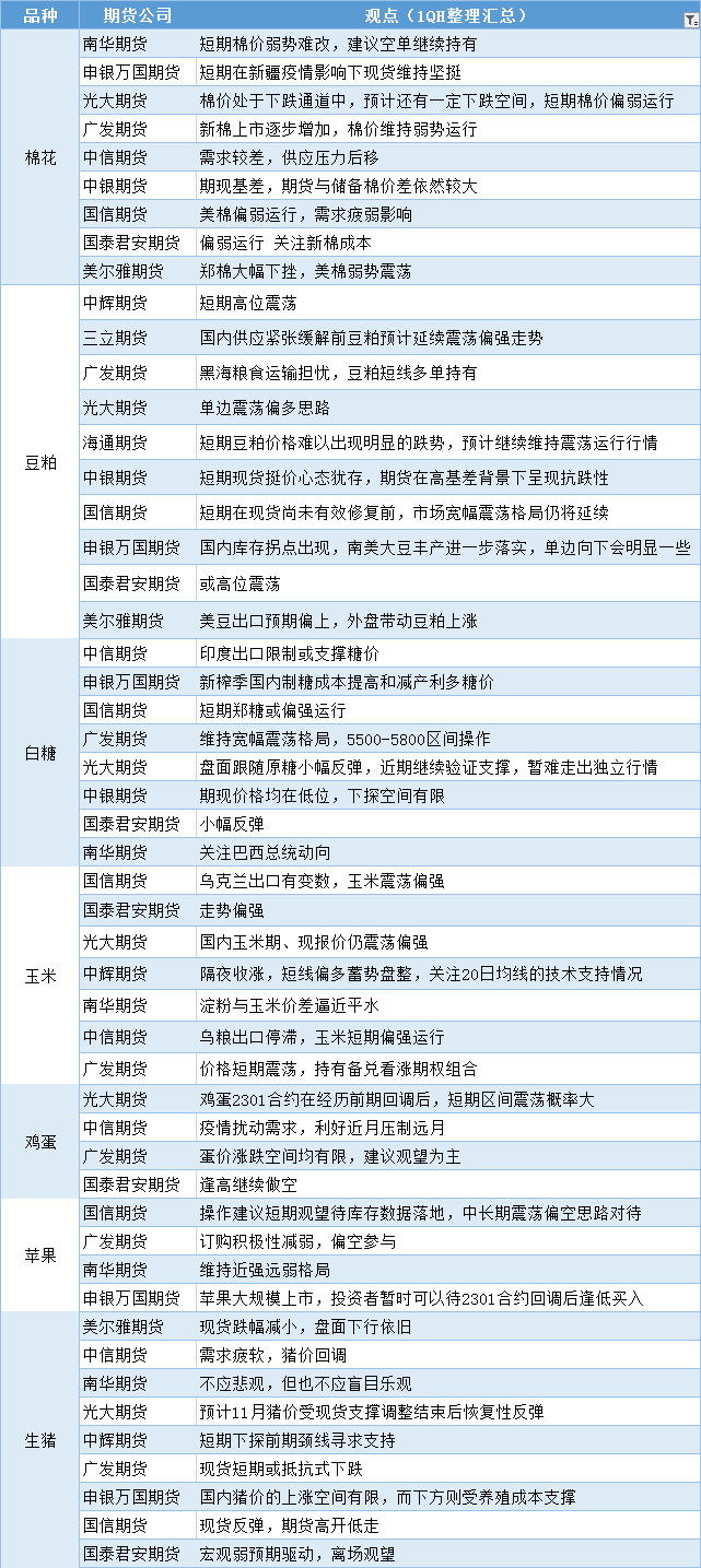 期货公司观点汇总一张图:11月1日农产品(棉花、豆粕、白糖、玉米、鸡蛋、生猪等)日期:2022-11-01 11:18