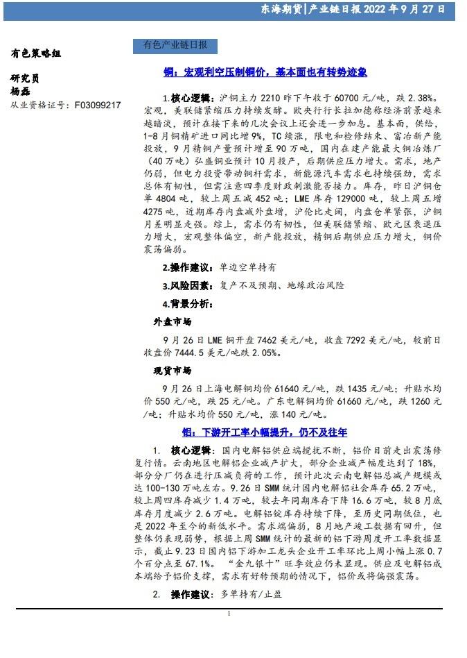 【东海期货9月27日产业链日报】有色篇:宏观利空压制铜价,基本面也有转势迹象