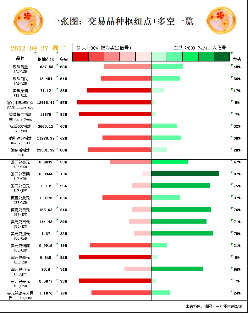 一张图:9月27日黄金白银、原油、股指、外汇“枢纽点+多空信号”;周二(9月27日)一张图看“枢纽点+多空信号”,品种包括:黄金、白银、原油、股指、欧元、英镑、日元、澳元、纽元、加元、富时中国A50、...日期:2022-09-27 12:18