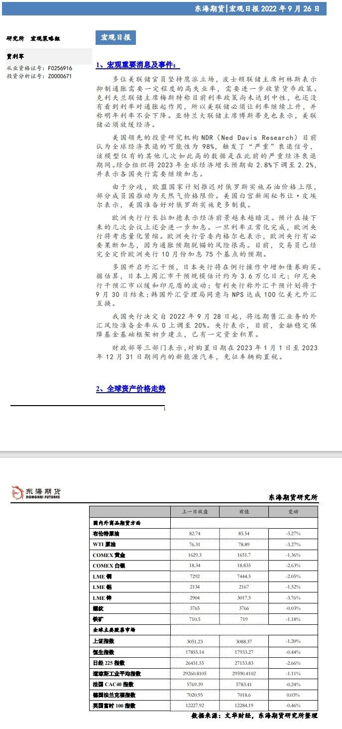 【东海期货9月27日宏观日报】:美元持续强势,全球风险资产继续下跌