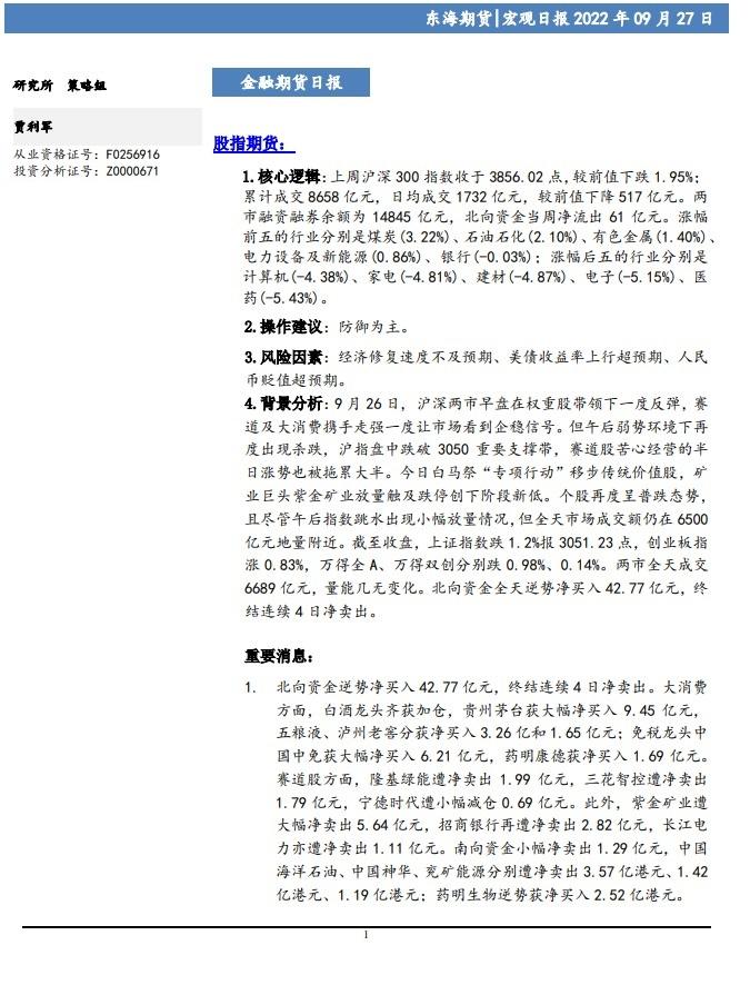 股指期货操作建议:防御为主。国债期货操作建议:暂时观望。免责声明:本报告立足于结合基本面及技术面对市场价格运行趋势及轮廓进行整体判断,提示可能存在的投资风险与投资机会。报告中的信息均源自于公开材料,我...日期:2022-09-27 11:47