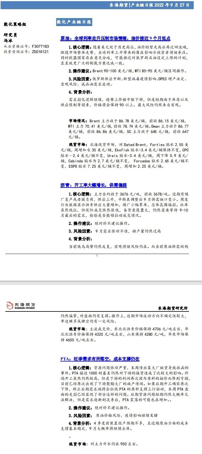 【东海期货9月27日产业链日报】能化篇:全球利率走升压制市场情绪,油价接近9个月低点