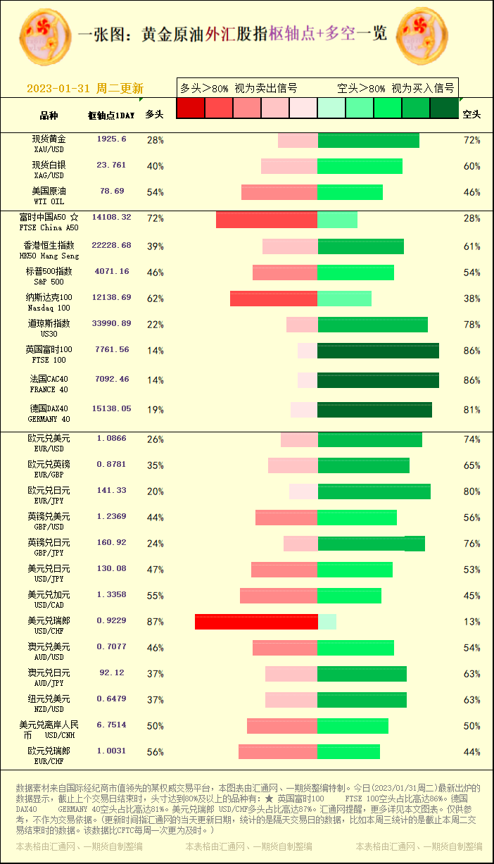 一张图:黄金原油外汇股指"枢纽点+多空占比"一览(2023/01/31周二)