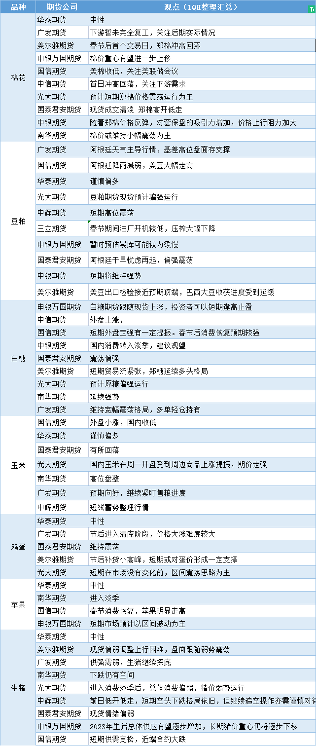 汇通财经APP讯——期货公司观点汇总一张图:1月31日农产品(棉花、豆粕、白糖、玉米、鸡蛋、生猪等)日期:2023-01-31 00:00