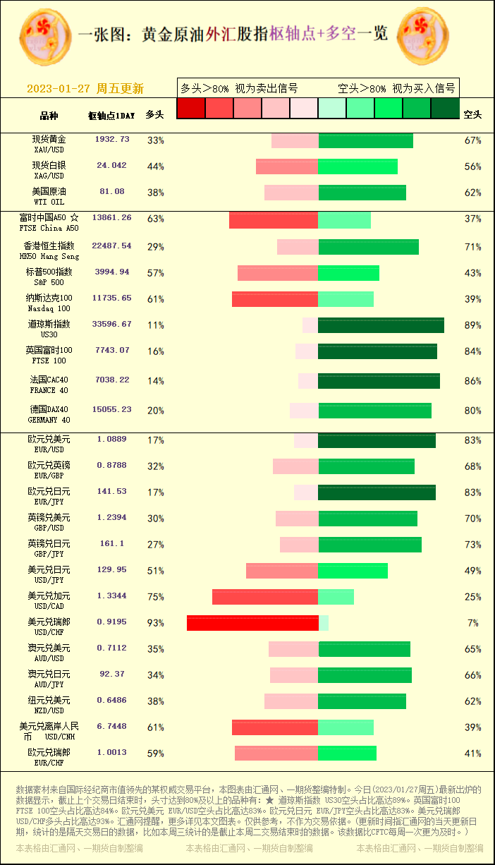 一张图:黄金原油外汇股指"枢纽点+多空占比"一览(2023/01/27周五)
