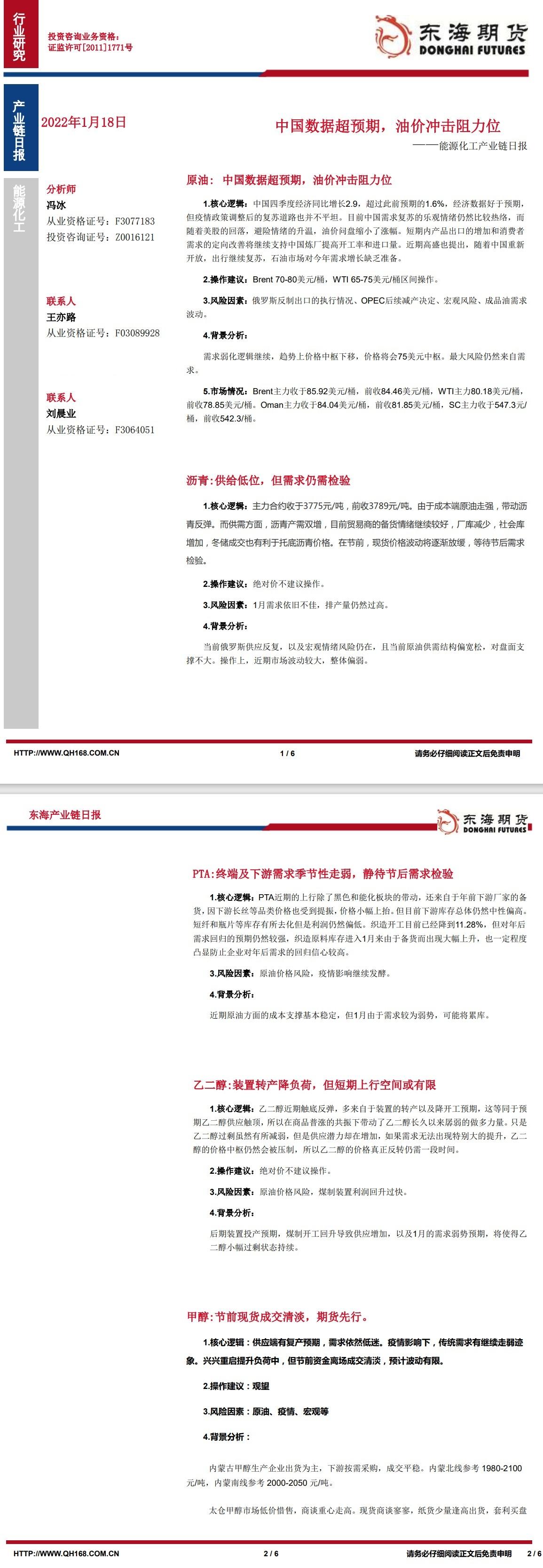 【东海期货1月18日产业链日报】能化篇:中国数据超预期,油价冲击阻力位