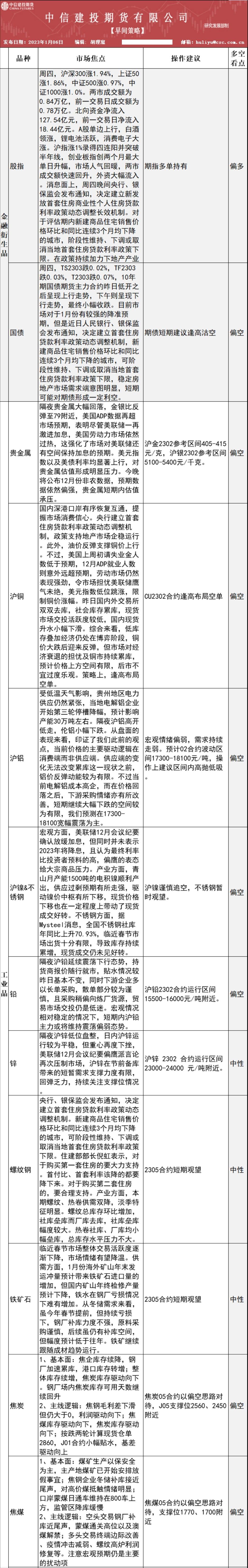 中信建投期货1月6日交易策略