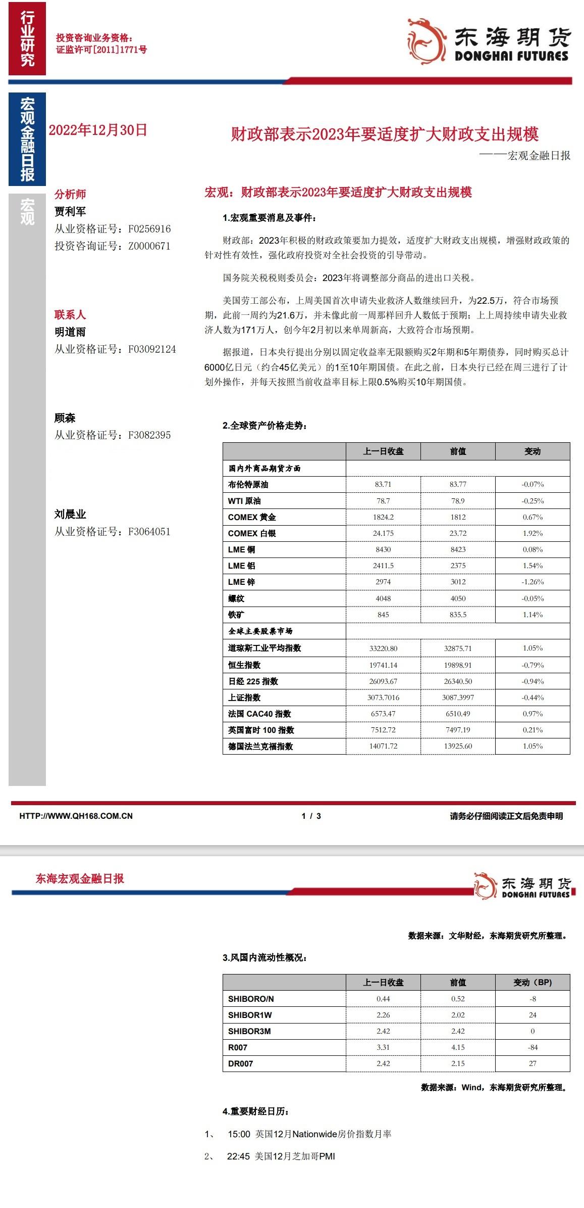 【东海期货12月30日宏观金融日报】:财政部表示2023年要适度扩大财政支出规模