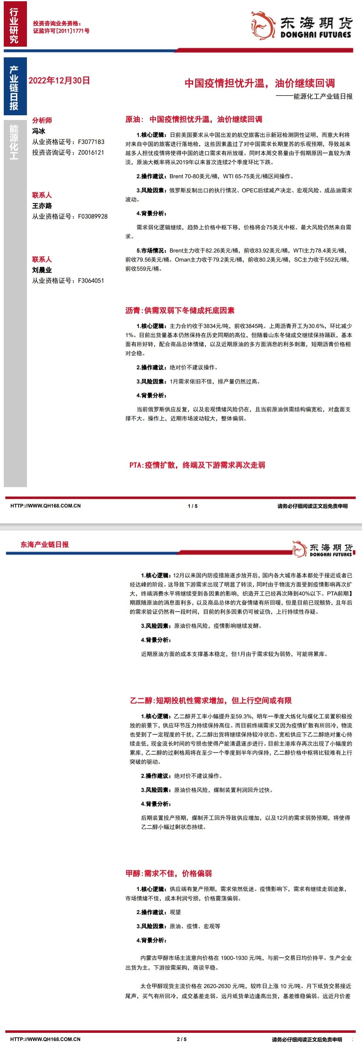 【东海期货12月30日产业链日报】能化篇:中国疫情担忧升温,油价继续回调