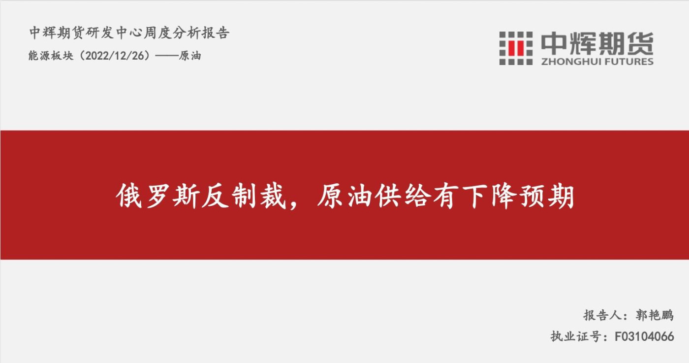 汇通财经APP讯——中辉期货发布原油周报,称俄罗斯反制裁,原油供给有下降预期,需关注全球原油需求变化。中辉期货公司授权文本由“专注期货开户交易及专业行情分析资讯网站”:【一期货 www.1qh.cn】...日期:2022-12-26 00:00