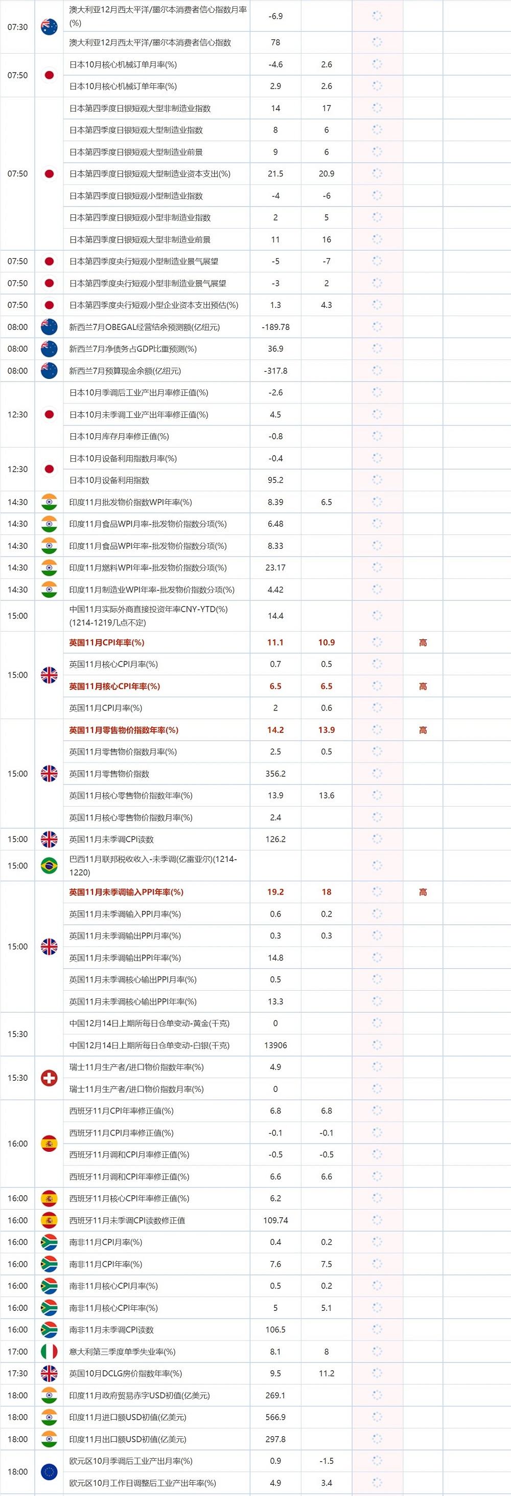 15:00 英国11月核心CPI年率(%) , 前值 6.5 , 预期值 6.5 , 公布值:待发布
