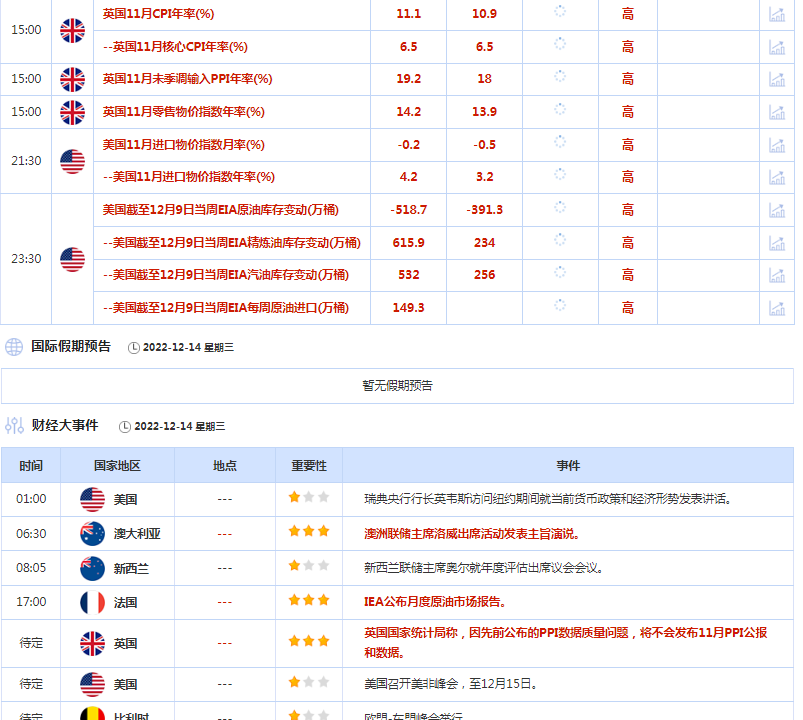 汇通财经APP讯——北京时间周三(12月14日),美元交投于104.04附近;美元周二全面下挫,此前数据显示美国上月消费者物价通胀率低于预期,强化了美联储在为期两天的会议结束后将放缓加息步伐的预期;金价上涨超1%,达到五个多月来的最高点至1824.39美元/盎司;油价收于每桶80美元以上,并录得逾一个月最大单日涨幅,因在美国数据显示通胀放缓后,投资者买入风险资产。市场还受到供应中断担忧提振,包括加拿大至美国的Keystone输油管道在上周发生大规模泄漏后仍处于停运状态。