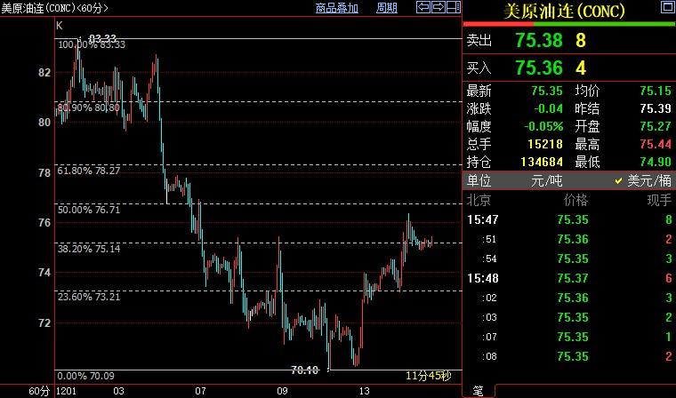 北京时间15:49,NYMEX原油期货上浮0.03%至75.41美元/桶;ICE布伦特原油期货下跌0.09%至80.79美元/桶。