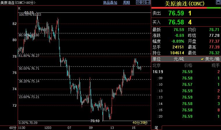 北京时间16:19,NYMEX原油期货下跌0.91%至76.58美元/桶;ICE布伦特原油期货下跌0.74%至82.14美元/桶。