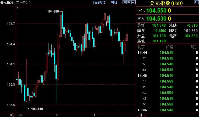 北京时间19:44,现货黄金上涨0.11%至1794.82美元/盎司;COMEX期金主力合约上涨0.26%至1804.7美元/盎司;美元指数下跌0.24%至104.545。