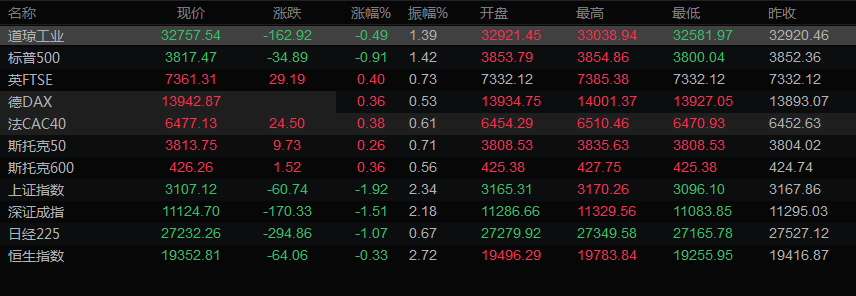 美股收盘情况:道琼斯指数收盘下跌0.49%,报32757.54点;标普500指数12月19日收盘下跌0.91%,报3817.30点;纳斯达克综合指数收盘下跌1.49%,报10546.03点。