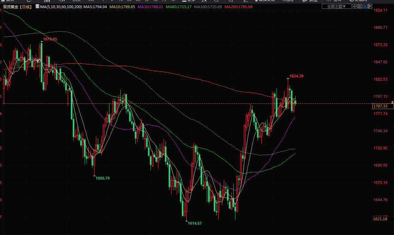 金价周一在淡静交投中下跌,利率上升的预期推动美债收益率走高,盖过了美元疲软的影响。现货金下跌0.2%,至每盎司1789.46美元。