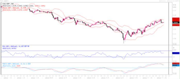 周二(12月20日),英镑兑美元微升0.26,收盘于1.2183。虽然12月份英国央行利率会议上票委们对于是否继续加息,开始出现不一致的声音,但考虑到当前英国的通胀水平仍处于40年来的高水平,11月份CPI仍达两位数在10.7%。为此,市场上的分析意见仍旧认为,在尽可能减低对经济伤害的情势下,英央行大概率会继续加息。息差上的拉近距离,预料能一定程度上给与英镑相应的支撑。日线图上,英镑兑美元继续徘徊在20日均线附近,技术指标经过超买调整后,开始回归中值区域,但指向不明朗。4小时图上,各类技术指标则开始出现低位拉抬的迹象。在本周余下的交易时间内,英镑兑美元波动将主要集中在1.2085-1.2250之间。