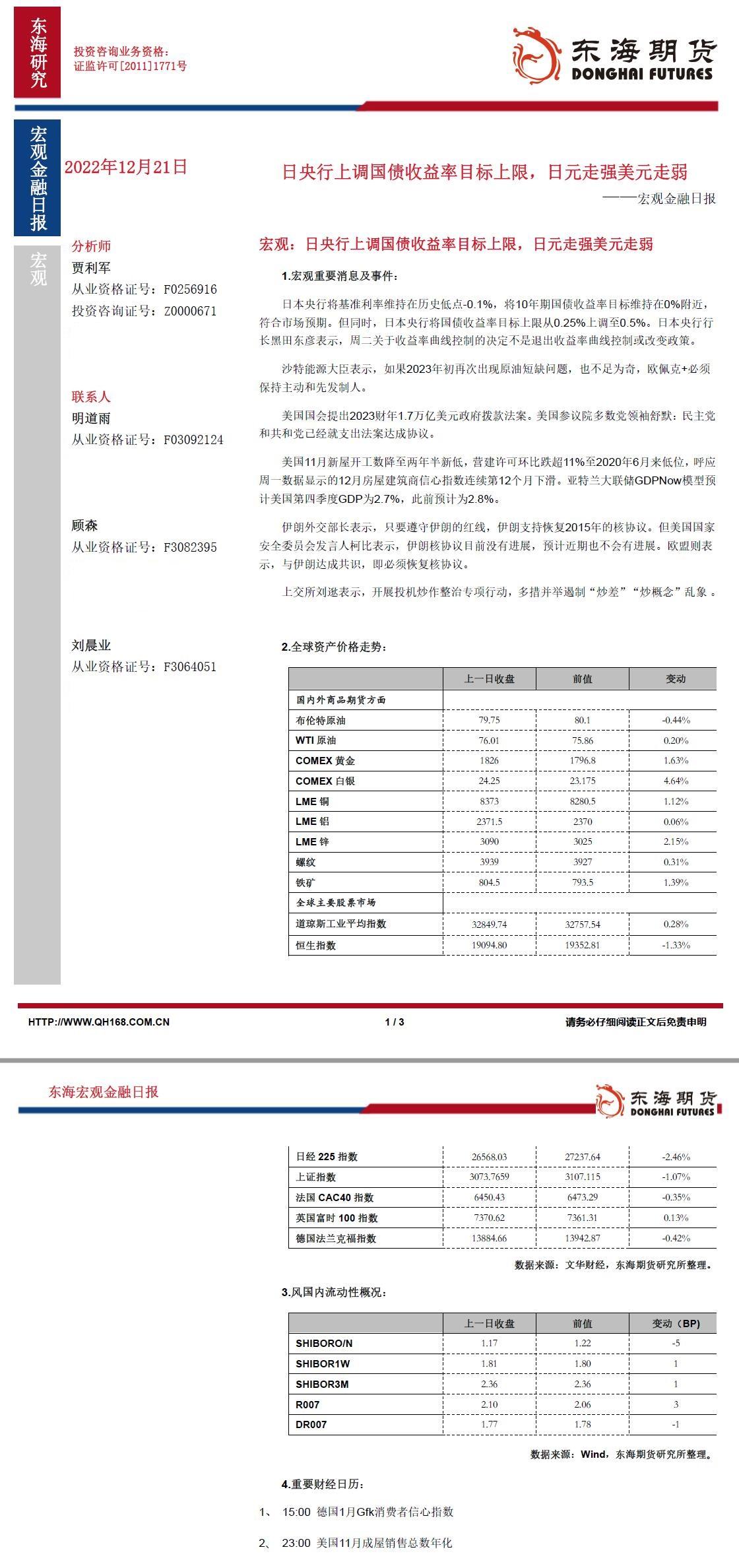 【东海期货12月21日宏观金融日报】:日央行上调国债收益率目标上限,日元走强美元走弱