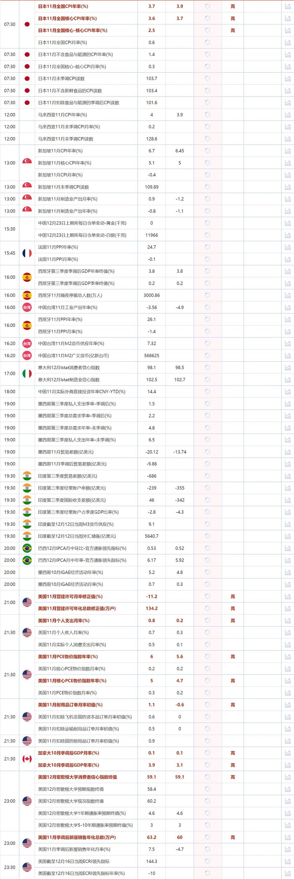 07:30 日本11月全国核心CPI年率(%) , 前值 3.6 , 预期值 3.7 , 公布值:待发布