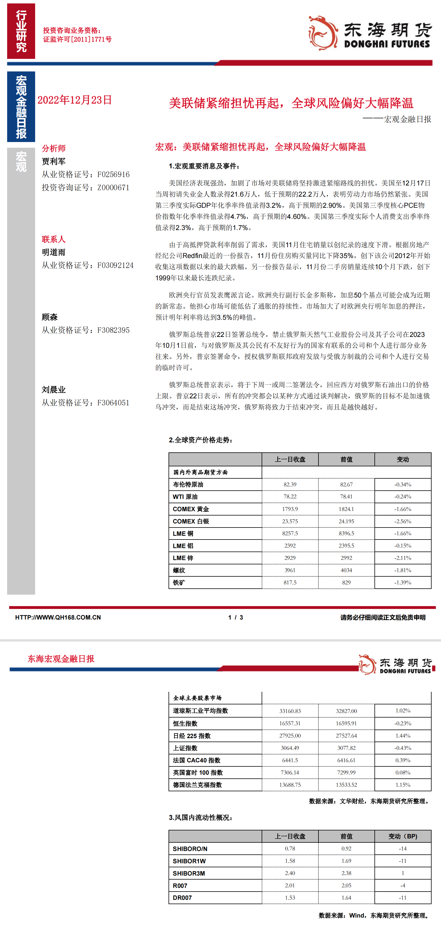 【东海期货12月23日宏观金融日报】:美联储紧缩担忧再起,全球风险偏好大幅降温