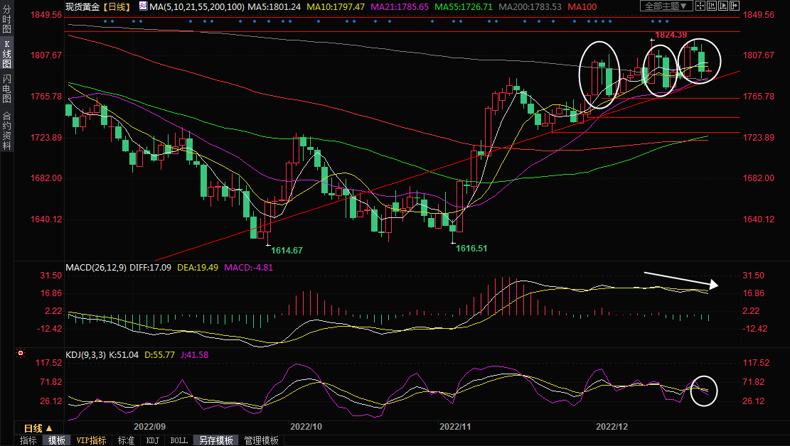 整体来看,虽然隔夜美国初请数据和GDP终值,令金价承压明显,短线看空信号也显著增强,但下方还有200日均线1783.53附近强支撑,临近圣诞假期,金价短线进一步跌幅可能会受限,而且市场对美国PCE数据和耐用品订单数据的预期也偏向力度金价,金价隔夜大跌后,短线甚至有望迎来震荡反弹调整的机会,需要提防金价探底回升的可能性。
