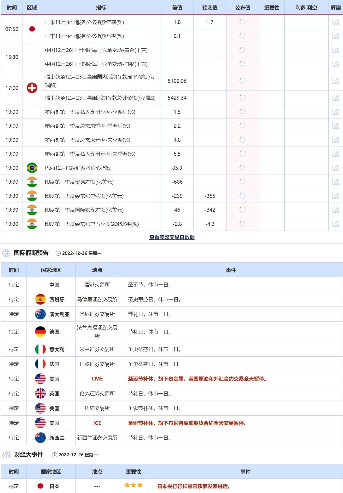 汇通财经APP讯——12月26日(周一),投资者需关注的重点数据:日本11月企业服务价格指数年率 ,日本11月企业服务价格指数月率 , 中国截至12月26日当周钢银全国城市总库存量, 巴西12月FGV消费者信心指数。需关注的大事件:日本央行行长黑田东彦发表讲话;全球各大交易所的休市公告,特别要注意:因为圣诞节补休,美国CME旗下贵金属、美国原油和外汇合约交易全天暂停;美国ICE旗下布伦特原油期货合约全天交易暂停。