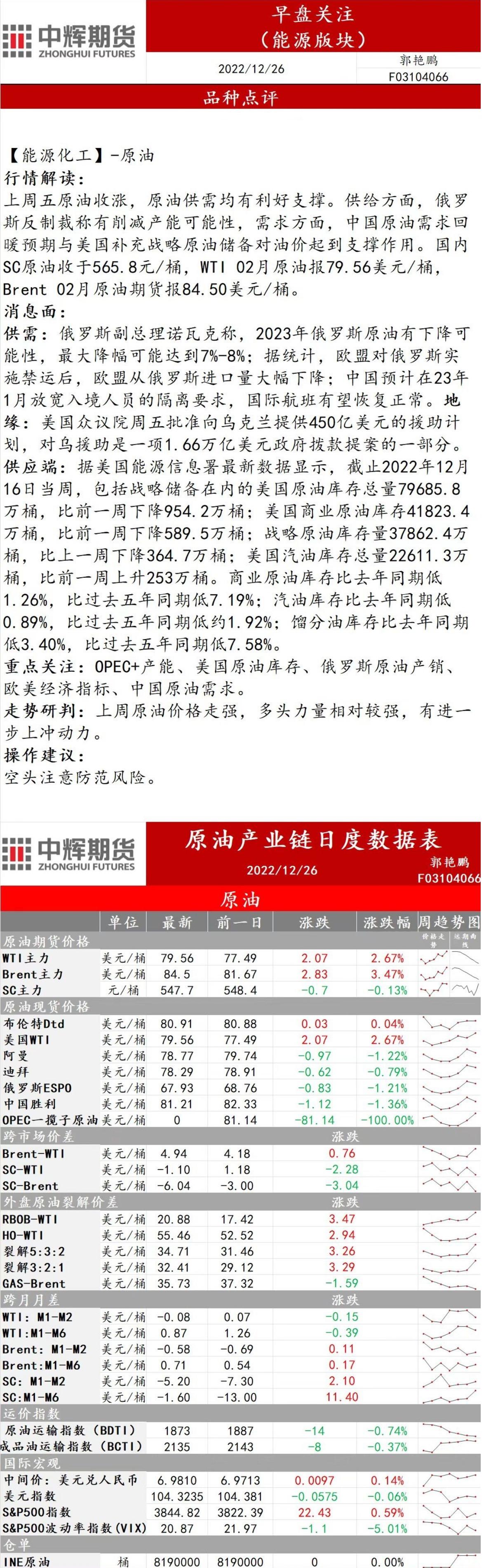 12月26日,中辉期货发布能源早盘关注,称上周原油价格走强,多头力量相对较强,有进一步上冲动力,建议空头注意防范风险。