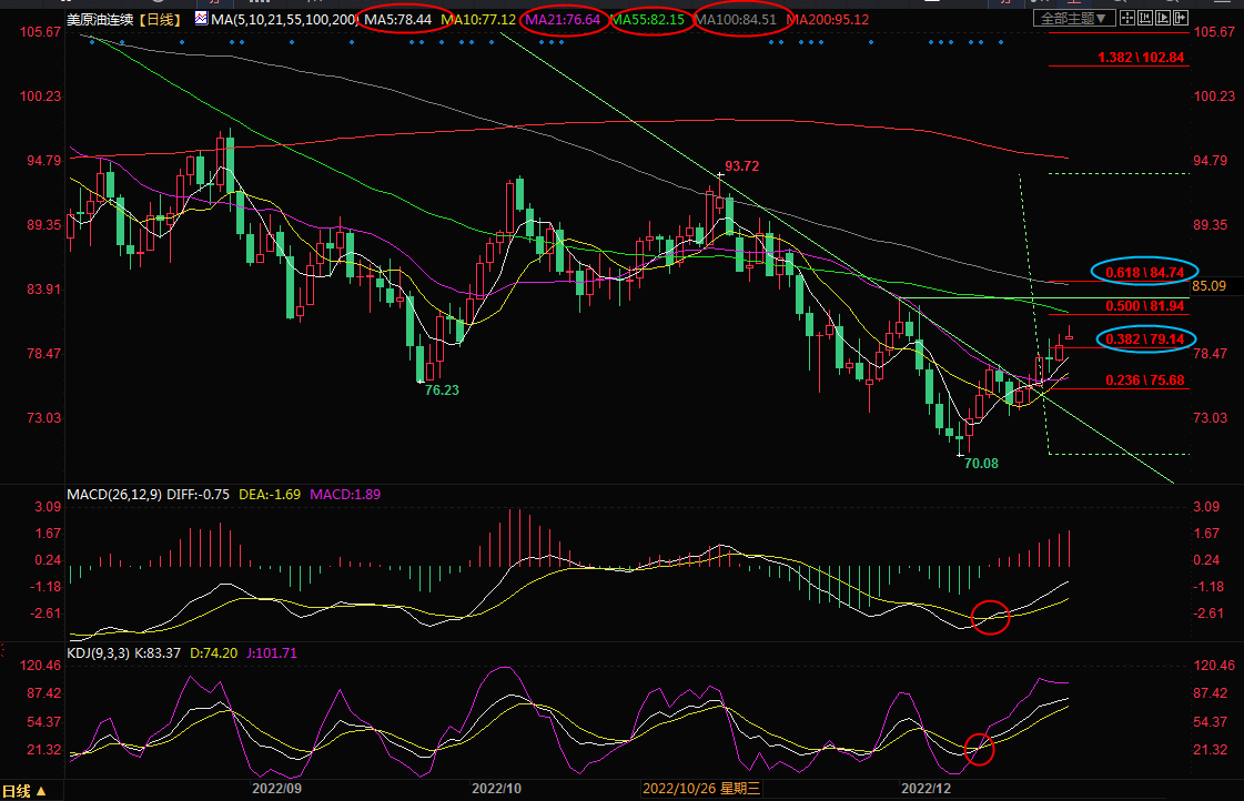 日线级别:震荡上涨;油价顶破下行趋势线之后持续上涨,MACD金叉,KDJ金叉10日均线上穿21日均线,短线偏向多头,有望进一步试探55日均线82.15附近阻力,93.72-70.08跌势的50%回撤位阻力也在该位置附近,进一步阻力在12月1日高点83.31附近,61.8%回撤位阻力在84.74附近,略高于100日均线。