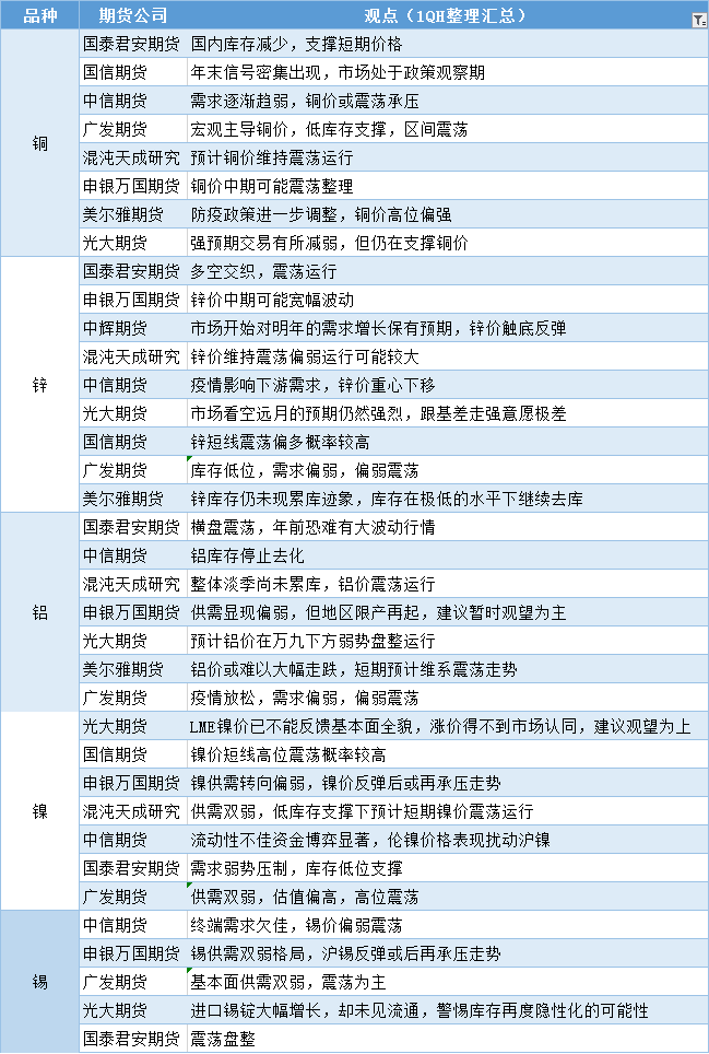 期货公司观点汇总一张图:12月27日有色系(铜、锌、铝、镍、锡等)