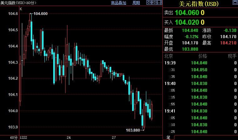 北京时间19:40,现货黄金上涨0.69%至1810.17美元/盎司;COMEX期金主力合约上涨0.77%至1818.1美元/盎司;美元指数下跌0.13%至104.040。