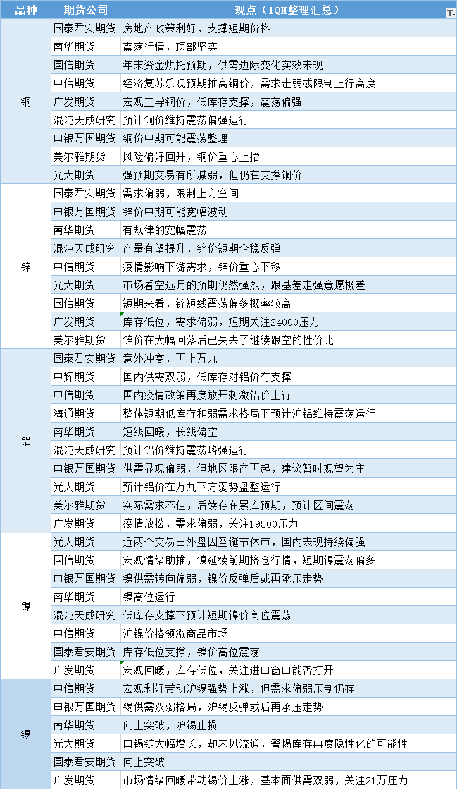 期货公司观点汇总一张图:12月28日有色系(铜、锌、铝、镍、锡等)