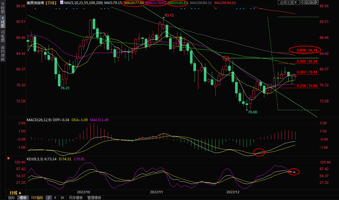 下方10日均线支撑目前在77.58附近,21日均线支撑在76.72附近,若意外失守该支撑,则增加短线看空信号;23.6%回撤位支撑在75.68附近,12月20日低点支撑在74.44附近。
