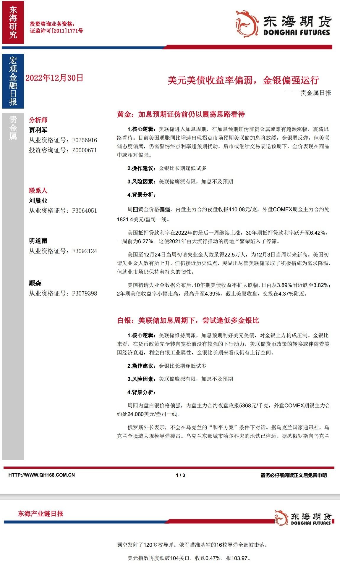 【东海期货12月30日产业链日报】贵金属篇:美元美债收益率偏弱,金银偏强运行