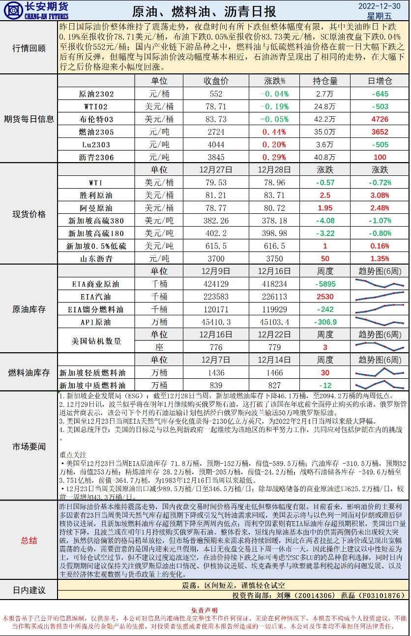 12月30日,长安期货发布原油早评,称EIA库存再度超预期积累,供需拉扯下震荡走势或仍存试空机会,认为价格将震荡,建议区间短差,谨慎轻仓试空。