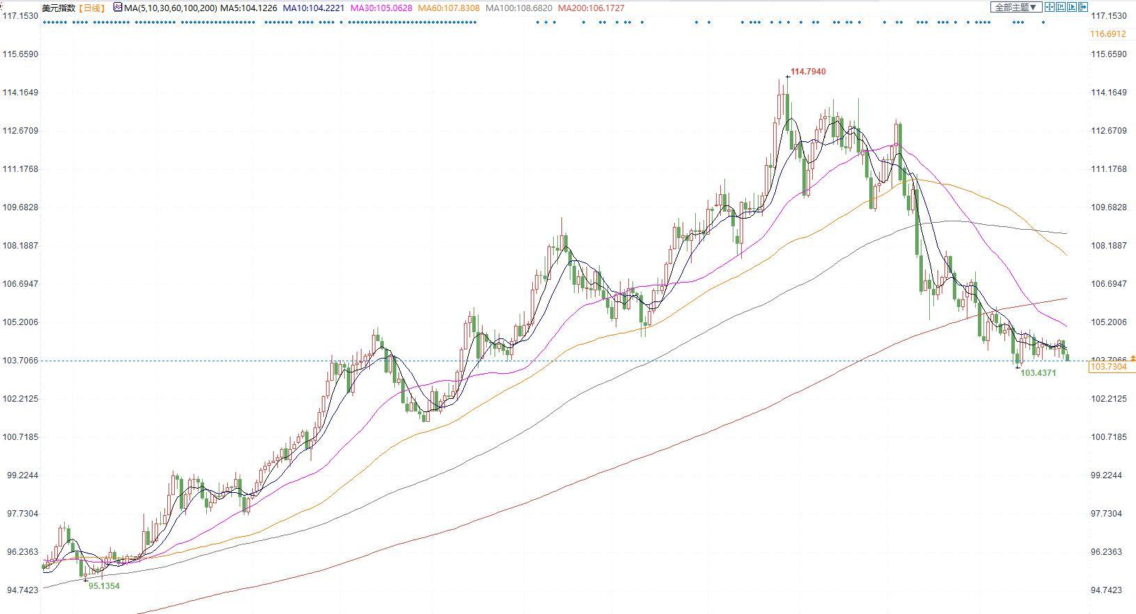 美元指数下跌,主要因中国放宽疫情限制支持了风险偏好,同时市场预期美国经济前景不佳,这些因素施压了美元。不过全球经济放缓的担忧情绪,始终限制美元下行。