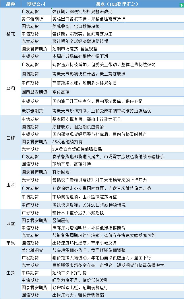 期货公司观点汇总一张图:1月3日农产品(棉花、豆粕、白糖、玉米、鸡蛋、生猪等)