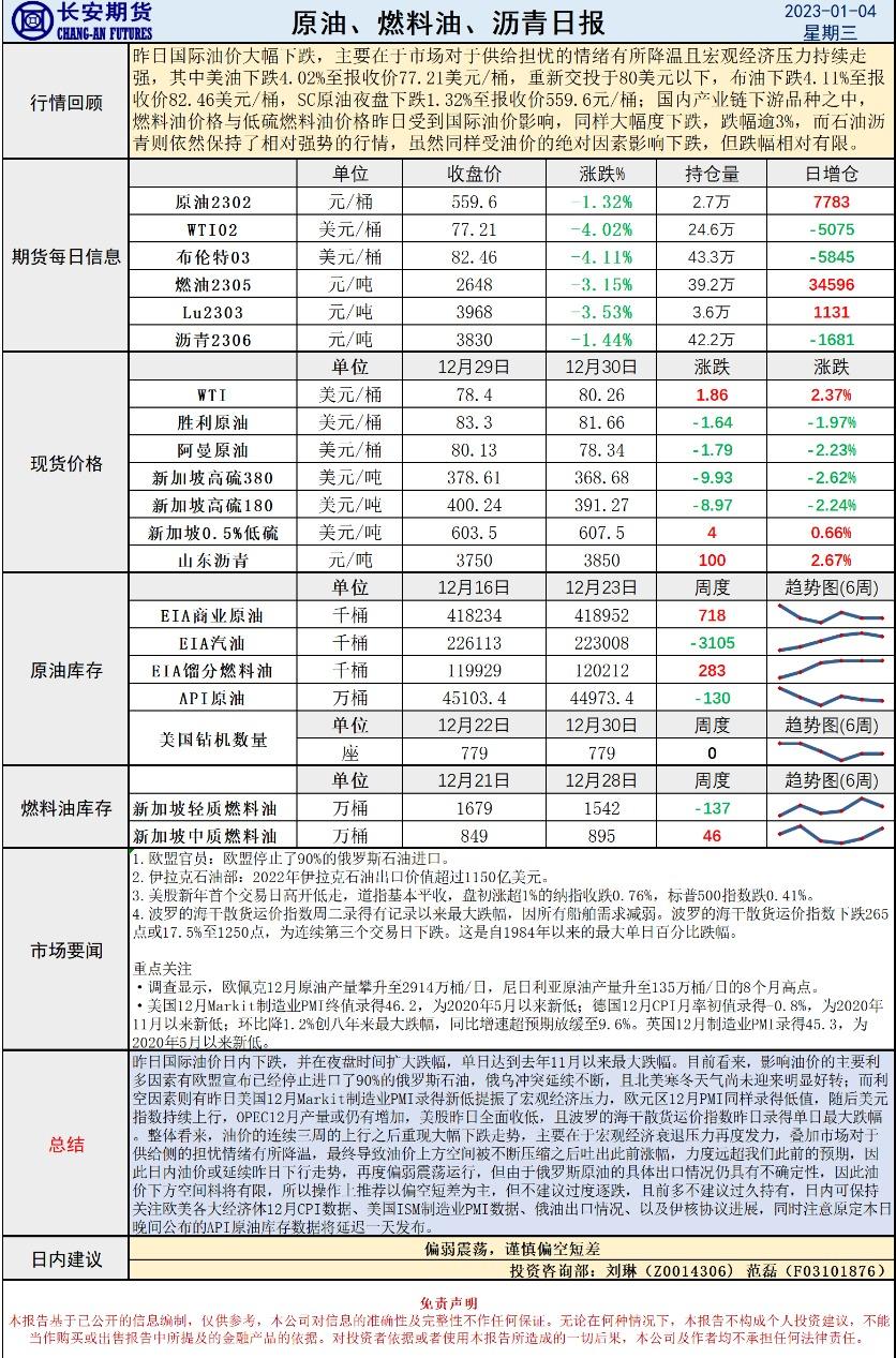 1月4日,长安期货发布原油早评,认为原油将偏弱震荡,谨慎偏空短差。