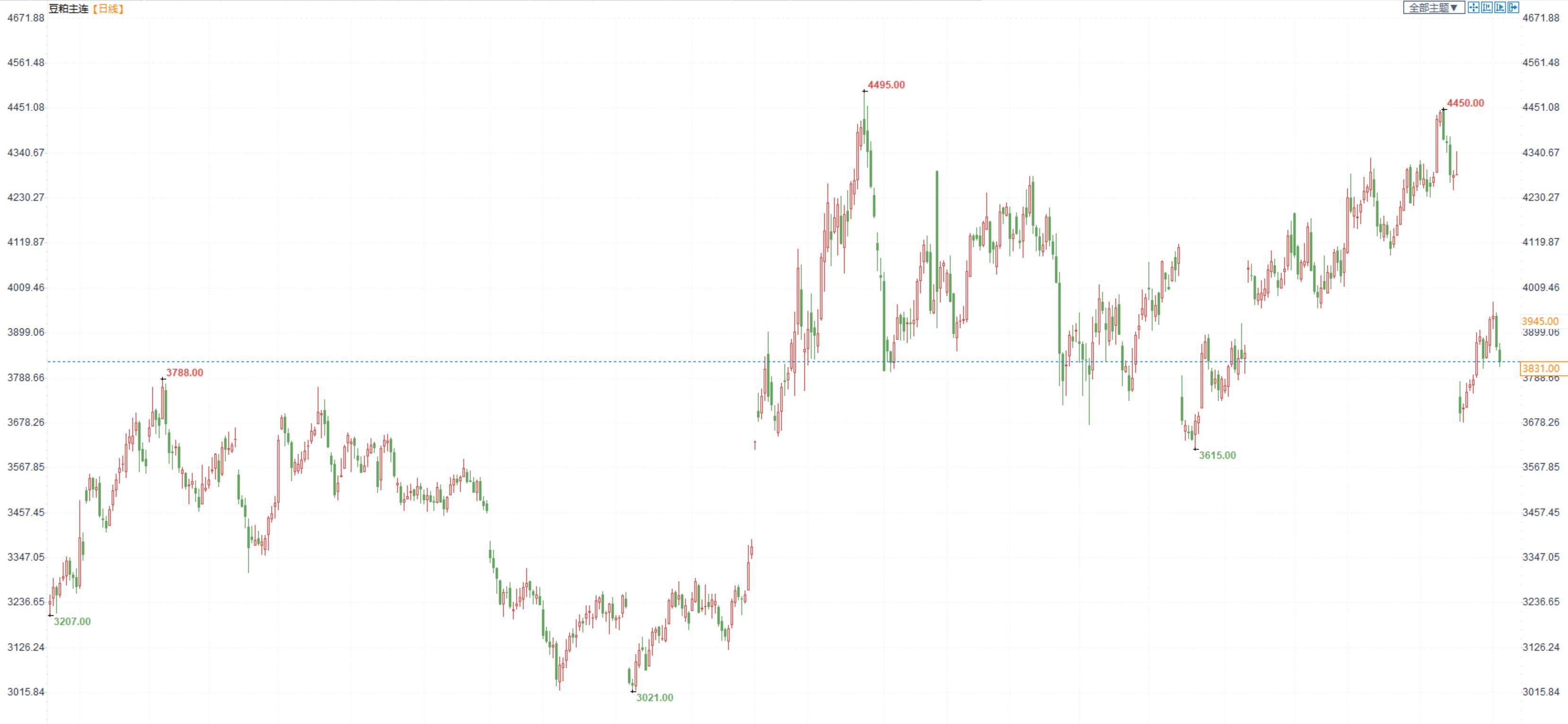 豆粕2305合约日内跌1.52%,收盘价3831元/吨,现货张家港43%蛋白豆粕4590元/吨