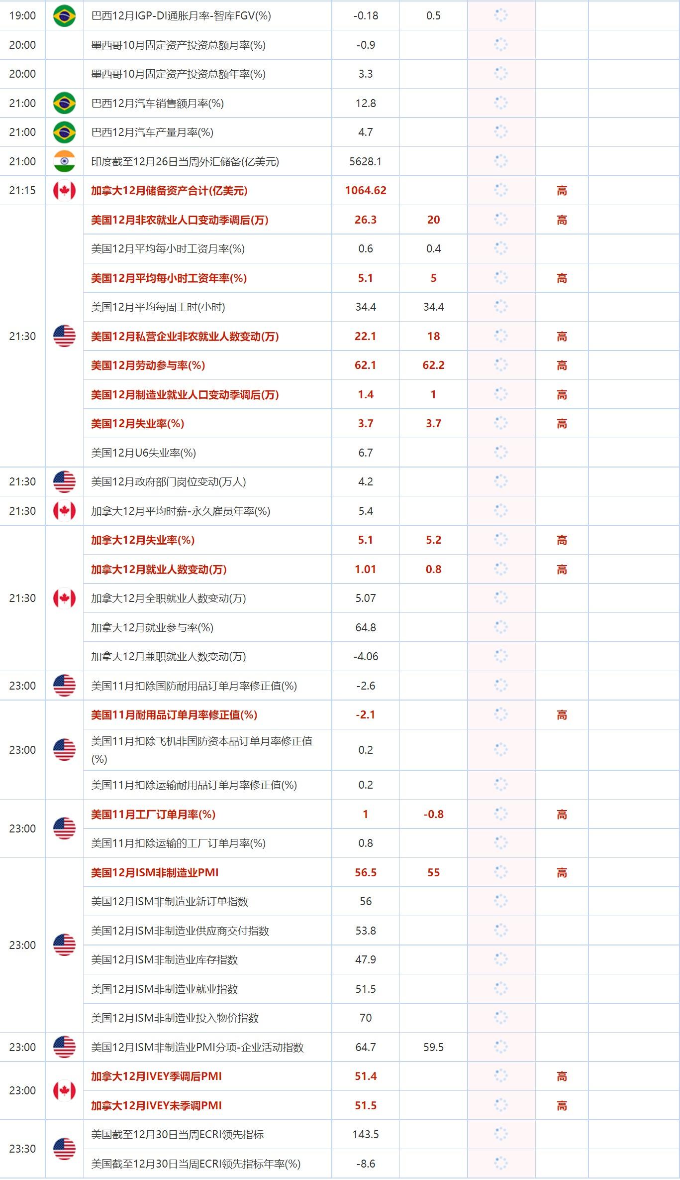 23:00 美国12月ISM非制造业PMI , 前值 56.5 , 预期值 55 , 公布值:待发布