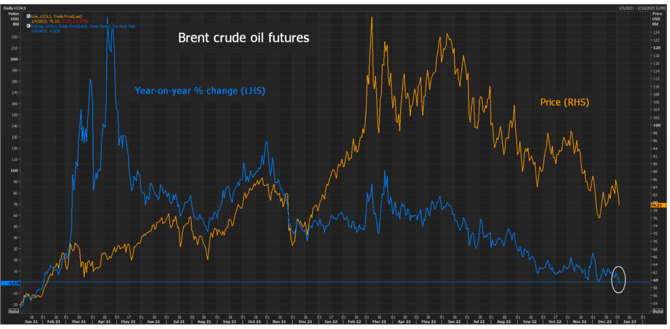 行情数据显示,布伦特原油价格在本周三曾一度跌至77.72美元附近,周五亚市盘中的最新报价仍低于每桶80美元。这是时隔近两年来,布伦特原油的同比变动首次转为负值。