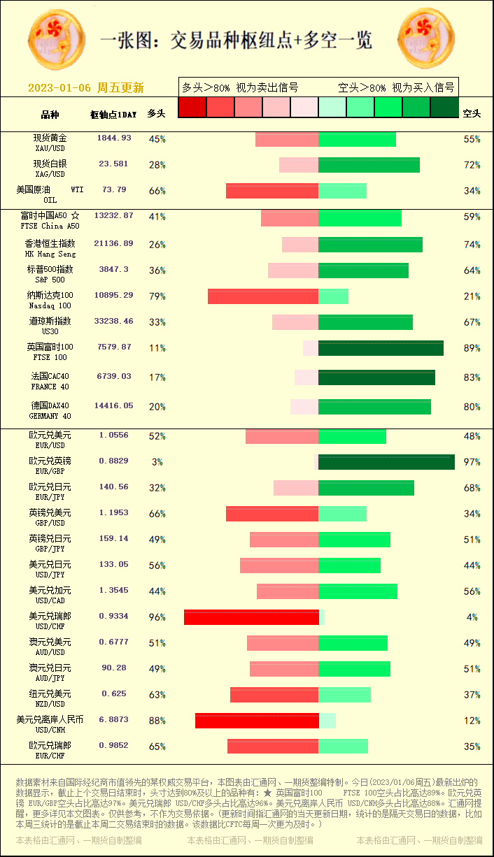 一张图:黄金原油汇股"枢纽点+多空占比"一览(2023/01/06周五)