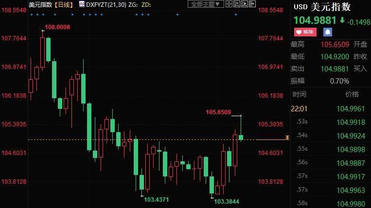 截止发稿,现货黄金周线上涨1.50%至1850.40美元/盎司;美元指数周线上涨1.41%至104.955。