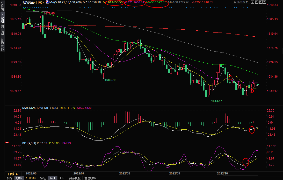 日线级别:震荡;MACD金叉,KDJ金叉,5日均线上穿10日均线结成金叉,失守10日均线1650.67前,短线仍略微偏向多头,初步阻力在21日均线1668.37附近,然后本周高点阻力在1674.77附近,若能顶破该阻力,则增加短线看涨信号;进一步阻力在10月11日高点1683.83附近,55日均线阻力在1692.48附近,强阻力在1700整数关口附近。