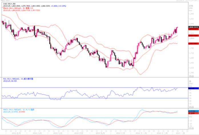 上周五美国非农报告显示,美国上个月增加了22.3万个就业岗位,略高于道琼斯调查经济学家预期的20万个就业岗位。不过,工资增长低于预期,当月增长0.3%,经济学家预期为0.4%。随后公布的另一项数据显示,美国服务业指标在2022年底意外萎缩,商业活动和订单指标大幅下降。美国供应管理协会(ISM)上个月的服务业指数从11月的56.5降至49.6,这是自2020年5月以来服务业PMI首次跌破50门槛,这表明占美国经济活动三分之二以上的服务业出现萎缩。当月美国服务业活动在逾两年半时间里首次出现萎缩。该项数据更是给予美元当头棒喝,美元加大了下跌幅度。在周五的数据公布后,联邦基金利率期货交易员增加了对美联储在2月1日两天会议结束时加息25个基点的押注。目前,加息25个基点的概率为73%,显见市场对于美联储将减低和减缓加息的预期与日俱增。分析师指出,这些数据提高了一些预期,即美联储在抑制通胀方面可能不会那么积极,这令美元遭受打压,从而刺激金价大涨。投资者现在将把注意力转向本周的美国通胀数据和美联储官员(包括主席鲍威尔)的一系列讲话,以寻找货币政策路径更明确的线索。彭博社撰文称,预计本周的美国通胀数据将与成本压力逐步下降的趋势保持一致,并将有助于确定美联储下次加息的规模。权威媒体调查显示,美国2022年12月季调后消费者物价指数月率料增长0.1%,此前11月也为增长0.1%。美国12月季调后核心CPI月率料增长0.3%,虽然升幅略高于11月的0.2%,但将与去年第四季度平均水平持平,远低于1-9月的平均水平0.5%,如果数据显示美国通胀率呈不断回落态势,料将继续给到黄金利好影响。