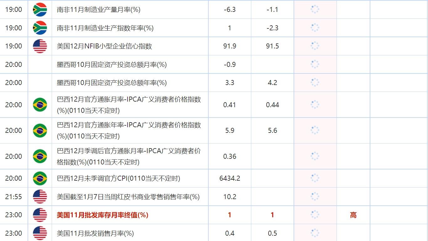 汇通财经APP讯——1月10日,投资者需要关注的重点数据:日本12月东京CPI年率,中国12月人民币各项贷款余额年率,中国12月社会融资规模-单月,中国12月M2货币供应年率和美国11月批发库存月率终值。需要关注的大事件包括美联储主席鲍威尔、英国央行行长贝利和欧洲央行执委施纳贝尔在瑞典央行举办的会议上发表讲话;美联储主席鲍威尔参与关于央行的独立性的讨论。