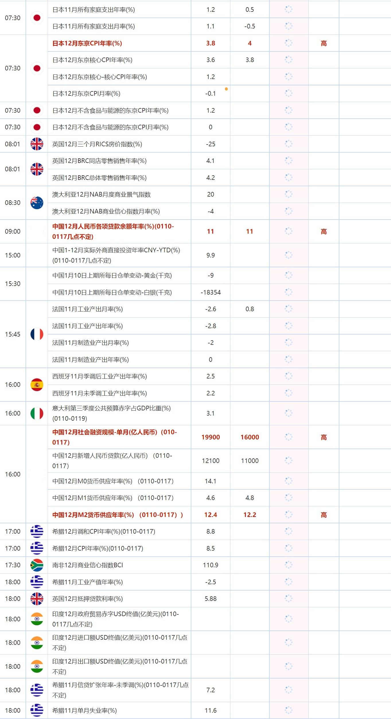 07:30 日本12月东京核心CPI年率(%) , 前值 3.6 , 预期值 3.8 , 公布值:待发布